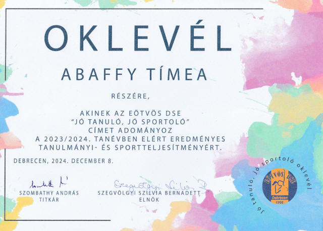 | 11, Tatai Dóra Klára | Debreceni Csokonai Vitéz Mihály Gimnázium | 5,0 |