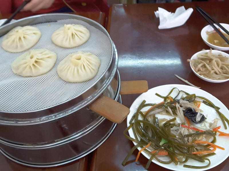 Első kínai étkezésünk menüje a képen. Legtöbbünk életének első pálcikákkal elfogyasztott falatja alga volt. Frissen főtt zöldséges és húsos táskákat fogyasztottunk ebédre.