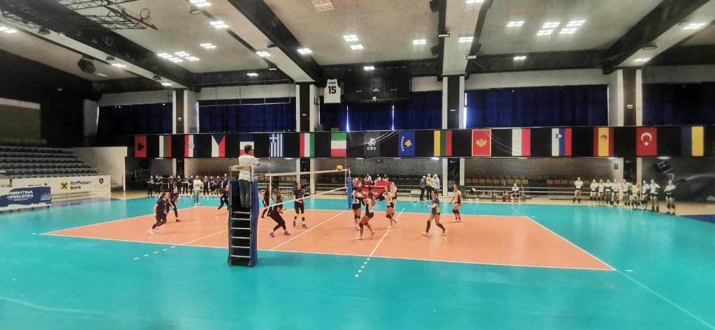 A KV Prishtina Elite elleni mérkőzés néhány jelenete. Háttérben a két nap múlva kezdődő Európa Bajnokságra kijutott országok zászlói, közük a magyar zászló.