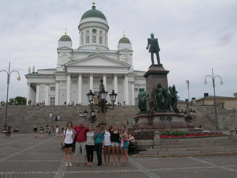 Csoportkép a Székesegyház és II. Sándor cár bronz szobra előtt.