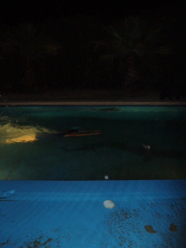 Mabel Harris házát is meglátogattuk. A háttérben pálmafák, ő a medencében.