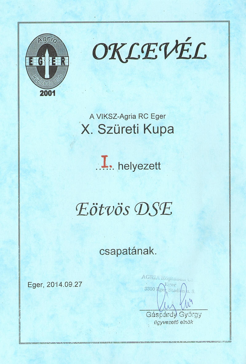 2014. szeptember 27-én felnőtt NB II-es csapatunk Egerben megnyerte a VIKSZ AGRIA X. SZÜRETI KUPÁT!
