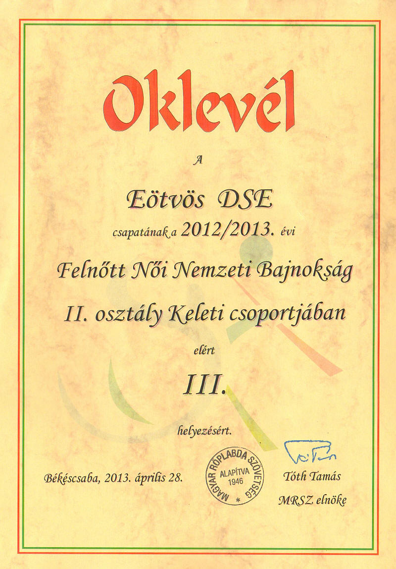 A 2012/2013. évi NBII-es bajnokságban az alábbi csapattal szerepeltünk. A mérleg: 15 győzelem, 6 vereség: 3. hely.
