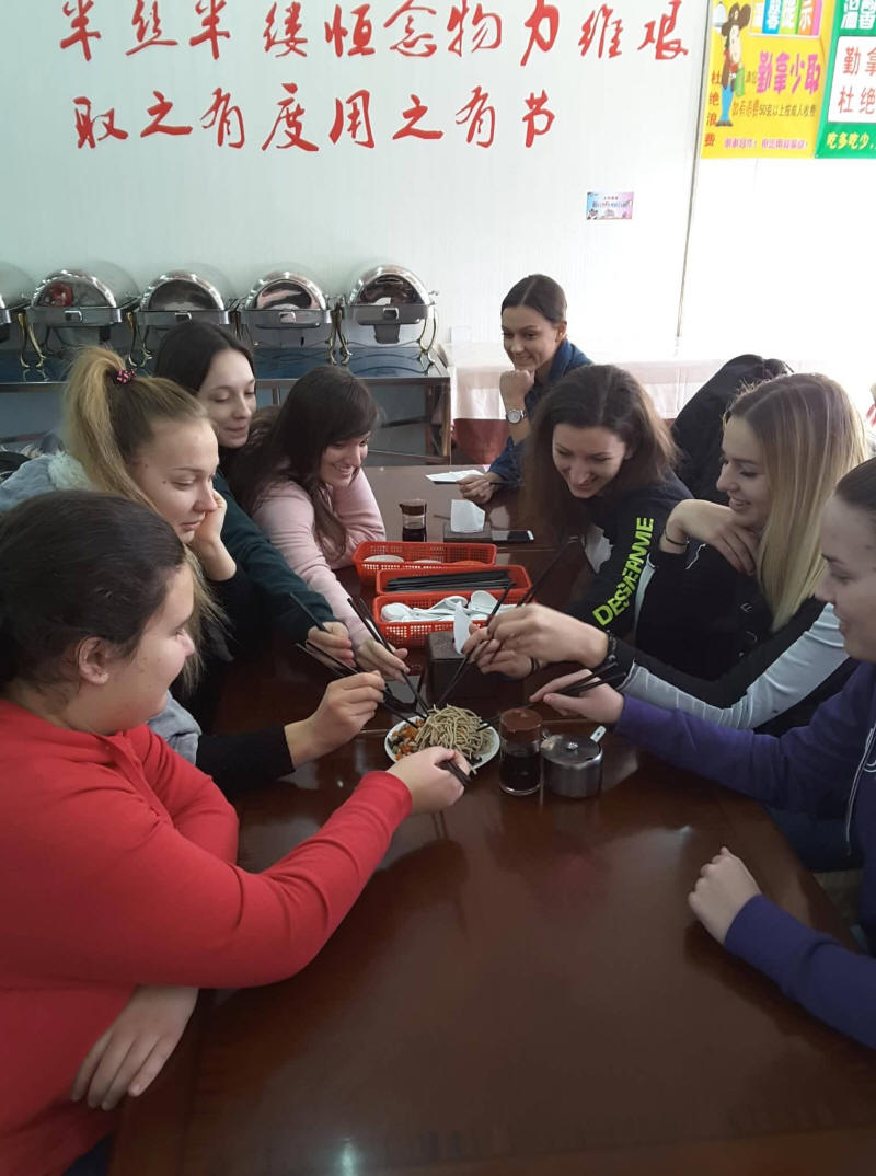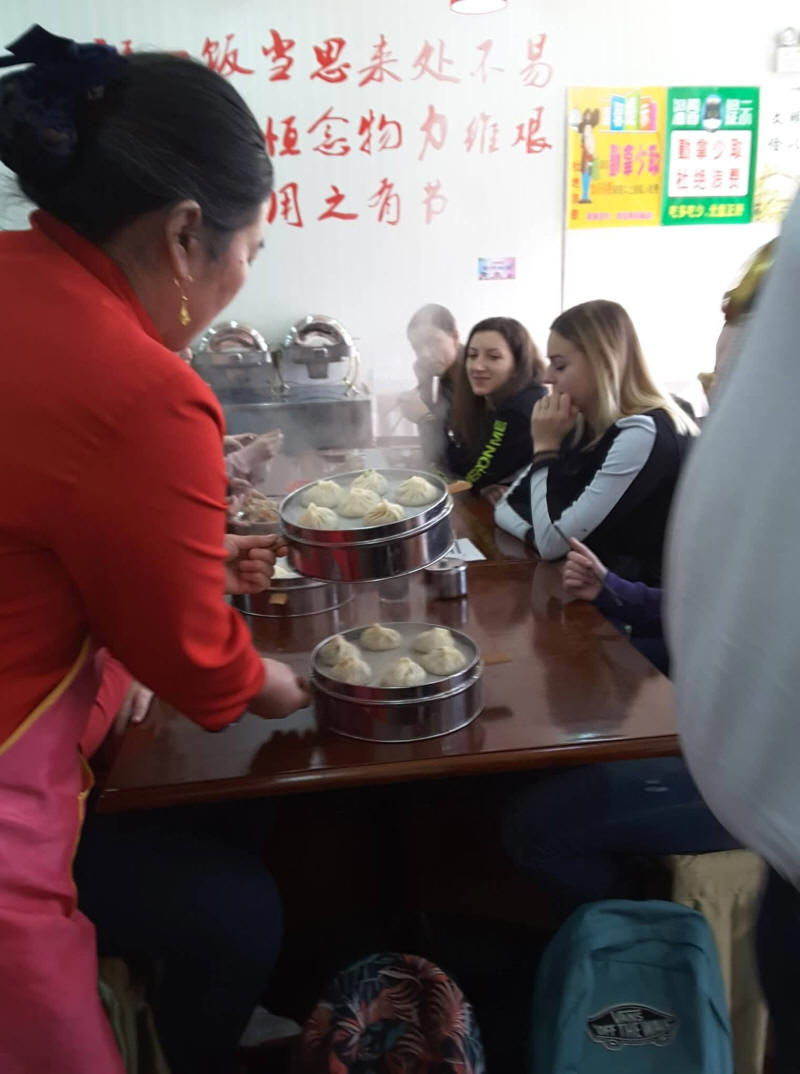 Első kínai étkezésünk menüje a képen. Legtöbbünk életének első pálcikákkal elfogyasztott falatja alga volt. Frissen főtt zöldséges és húsos táskákat fogyasztottunk ebédre.