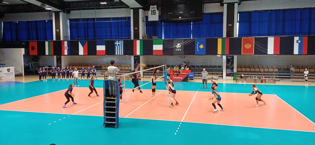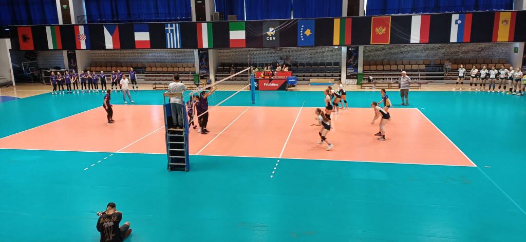 A KV Prishtina Elite elleni mérkőzés néhány jelenete. Háttérben a két nap múlva kezdődő Európa Bajnokságra kijutott országok zászlói, közük a magyar zászló.
