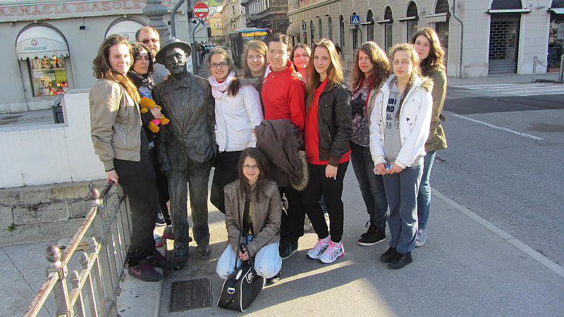 James Joyce szobra mellett csapatunk. A képek után a róla elnevezett kávézóba is betértünk.
